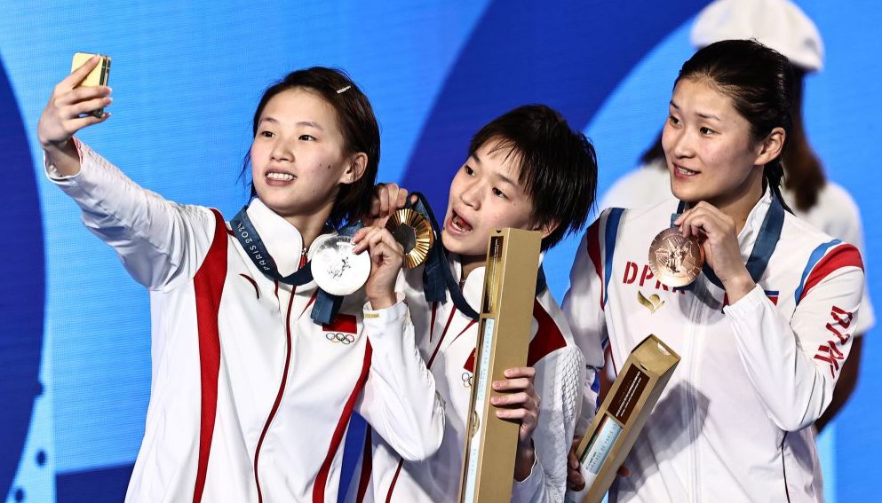 全运跳水女子项目结束 全红婵在跳水馆与队友拍照留念